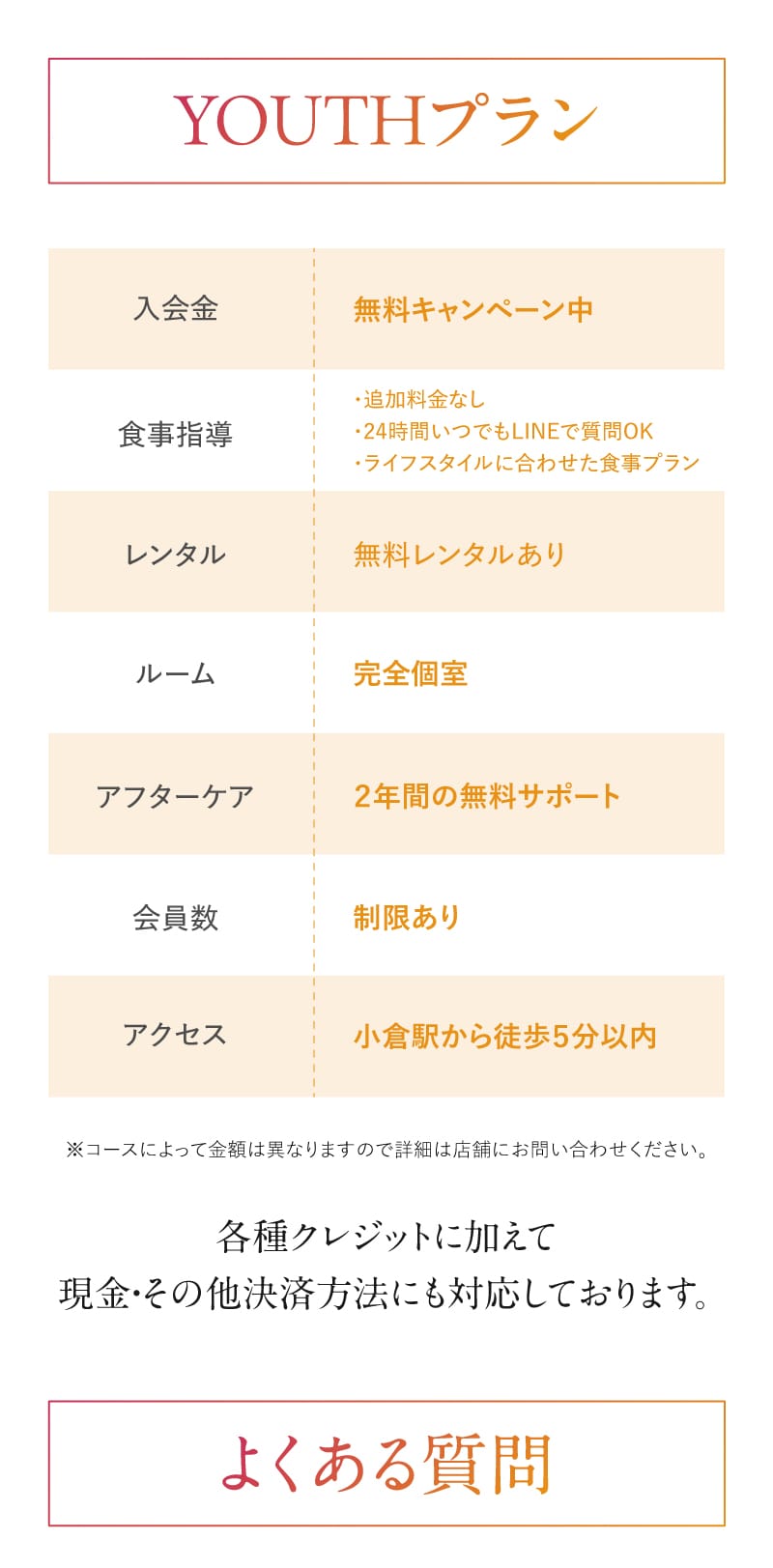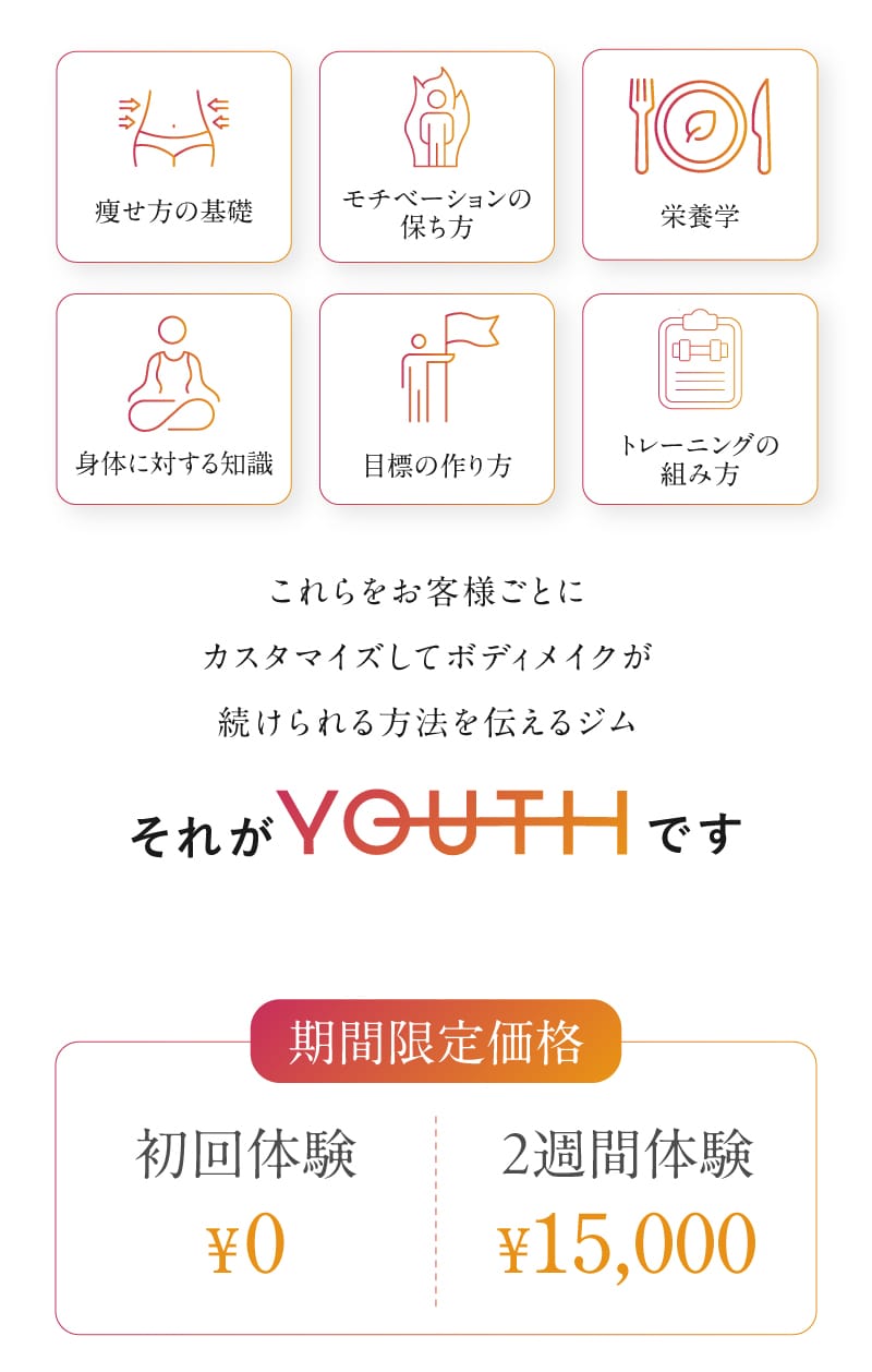 パーソナルジムなので値段は決して安いとは言えませんが、それ以上のことが身につくと思います。初心者の方ほどユースに通うことをオススメします。