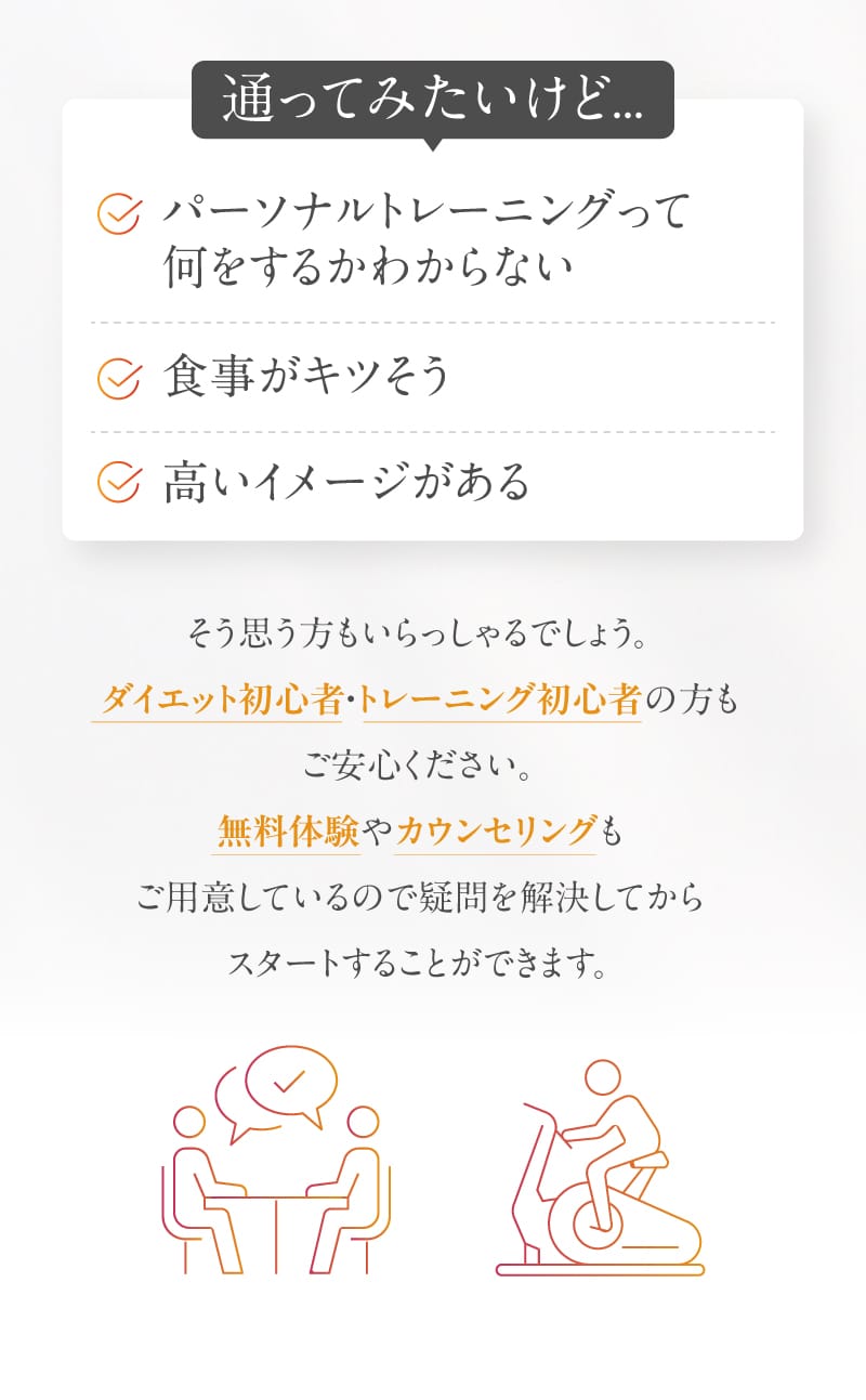 大学生の頃に24時間のジムに入会していましたが、人見知りのためトレーナーさんに話しかけることも出来ず器具の使いかたもわからずで結局辞めてしまった過去があり、不安でしたが、