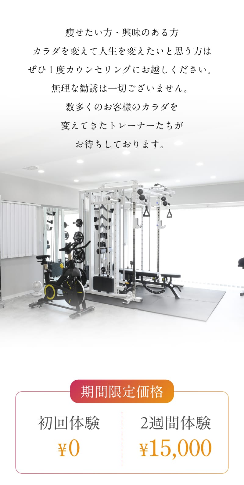 今までパーソナルジムに通ってみたいと、体験だけに行くことはありましたが実際に通いたいと思えるジムには出会えませんでした。